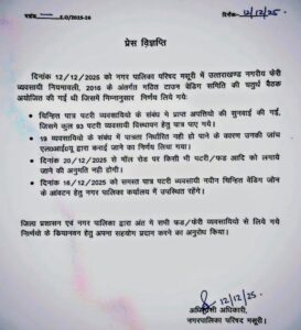 20 दिसंबर से माल रोड़ पर नहीं लगायीं जायेंगी कोई पटरी/फड कि दुकान