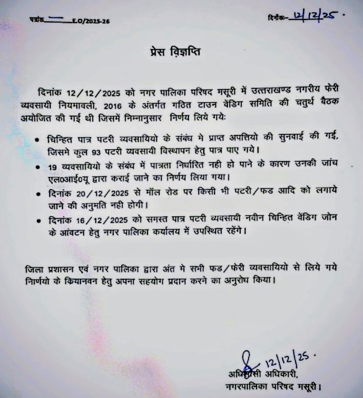 उत्तराखंड समाचार 365/धनवीर सिंह कुंमाई मसूरी- नगर पालिका परिषद मसूरी द्वारा प्रेस विज्ञप्ति के माध्यम से जानकारी प्रदान की गई…
