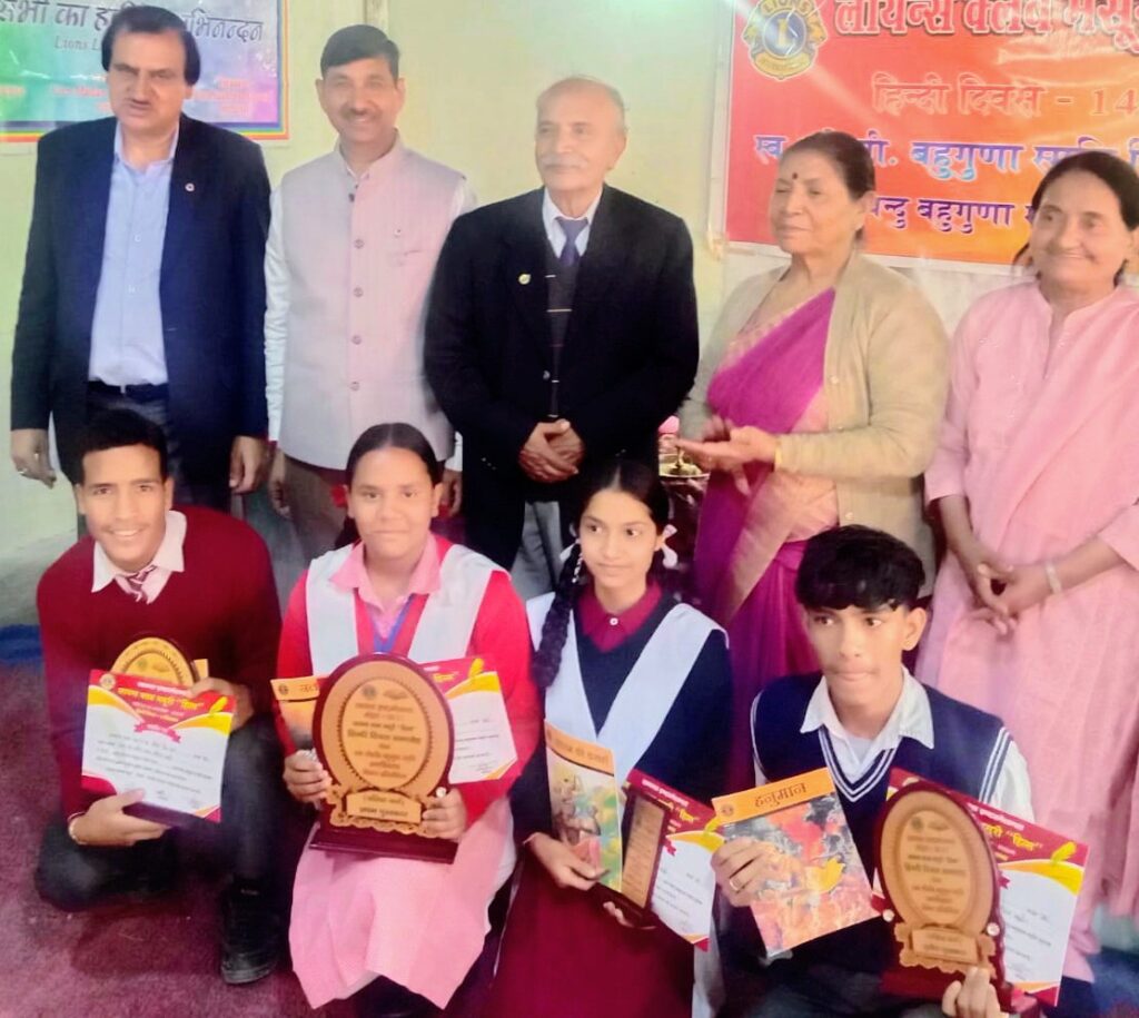 वही दूसरी ओर कनिष्ठ वर्ग में आर एन भार्गव इण्टर कॉलेज सुलेख प्रतियोगिता में चतुर्थ स्व0 बिंदु बहुगुणा स्मृति चलवैजंती प्राप्त कर विजेता बना। कार्यक्रम में मुख्य अतिथि मसूरी गर्ल्स इण्टर कॉलेज की सेवानिवृत्त हिंदी विभाग की वरिष्ठ प्रवक्ता संतोष आर्य ने राजभाषा हिंदी के महत्व पर प्रकाश डालते हुए सभी से गर्व के साथ मातृभाषा के प्रयोग हेतू आह्वान किया।और बताया कि व्यक्ति द्वारा अपने भावों की उपयुक्त अभिव्यक्ति अपनी मातृभाषा में ही हो सकती है।सभी प्रतिभागी छात्र छात्राओं को प्रेरणाप्रद कहानियों से संबंधित हिंदी साहित्य व शिक्षकों को हिंदी के महान साहित्यकारों के उपन्यास भेंट किये गए। साथ ही विभिन्न विद्यालयों में आयोजित “राखी बनाओं प्रतियोगिता” के विजेताओं को भी पुरस्कृत किया गया। इस अवसर पर कार्यक्रम संयोजक एवं संचालक डिप्टी डिस्ट्रिक्ट गवर्नर लायन अनुज तायल,अध्यक्ष लायन प्रवीण गुप्ता,सचिव लायन एम एम शर्मा,निधि बहुगुणा,अंजलि बहुगुणा,विवेक बहुगुणा,आर एन माथुर,जी के गुप्ता,संदीप अग्रवाल,राजीव अग्रवाल,ममता भाटिया,मधुलिका माथुर,अनु हांडा,माधुरी शर्मा सहित विभिन्न विद्यालयों के शिक्षक शिक्षिकाएं उपस्थित रहे।