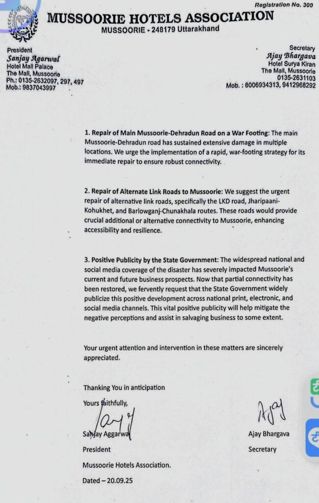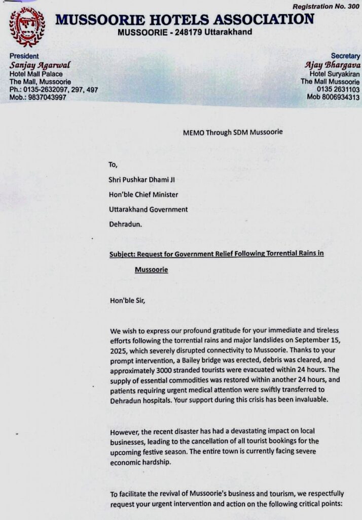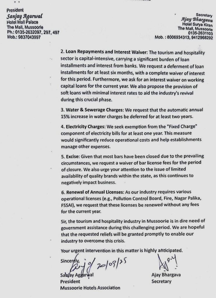 ज्ञापन में मांग की गई है कि भारी मूसलाधार बरसात के कारण आई आपदा में मसूरी देहरादून संपर्क मार्ग पूर्ण रूप से क्षतिग्रस्त हो गया है और मसूरी में पर्यटकों कि संख्या में आयीं कमी के कारण पर्यटक व्यवसाय पूर्ण रूप से ठप्प हैं।‌ वह सरकार से मांग करते हैं कि मसूरी में होटल स्वामियों को सरकार के द्वारा करो के साथ बिजली,पानी के बिलों में छूट प्रदान की जायें।