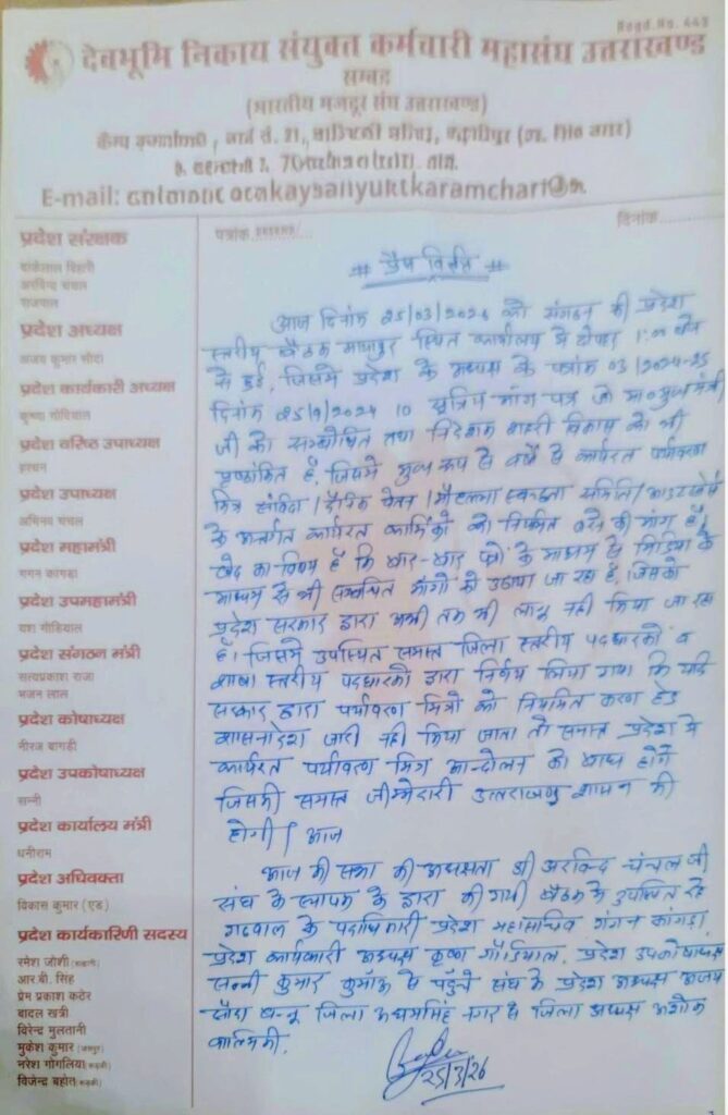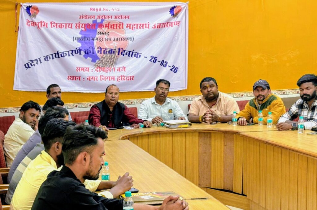 हरिद्वारदेवभूमि निकाय संयुक्त कर्मचारी महासंघ उत्तराखंड (भारतीय मजदूर संघ उत्तराखंड) द्वारा आज संगठन की प्रदेश स्तरीय बैठक हरिद्वार नगर निगम सभागार  में संपन्न हुई, बैठक में 10 सूत्रीय मांग पत्र जो प्रदेश के मुख्यमंत्री को संबोधित तथा निदेशक शहरी विकास को भी पृष्ठांकित हैं।