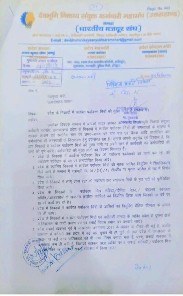 पत्र में मुख्य रूप से वर्षों से कार्यरत पर्यावरण मित्र संविदा/दैनिक वेतन/मोहल्ला स्वच्छता समिति/आउटसोर्स के अंतर्गत कार्यरत कर्मियों को नियमित करने की मांग है।