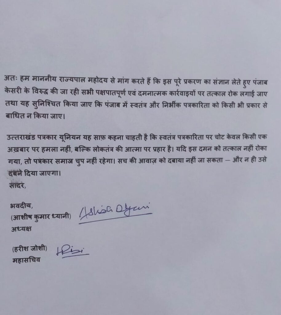 उत्तराखंड पत्रकार यूनियन ने स्पष्ट मांग की है कि पंजाब केसरी के विरुद्ध की जा रही सभी कथित दमनात्मक और पक्षपातपूर्ण कार्रवाइयों को तत्काल रोका जाए तथा पंजाब में स्वतंत्र, निष्पक्ष और निर्भीक पत्रकारिता के लिए अनुकूल वातावरण सुनिश्चित किया जाए।