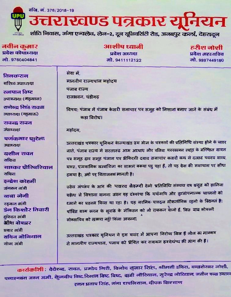 उत्तराखंड पत्रकार यूनियन ने इस संबंध में अपना विरोध पत्र ई-मेल के माध्यम से माननीय राज्यपाल, पंजाब को प्रेषित कर तत्काल हस्तक्षेप की मांग की है।