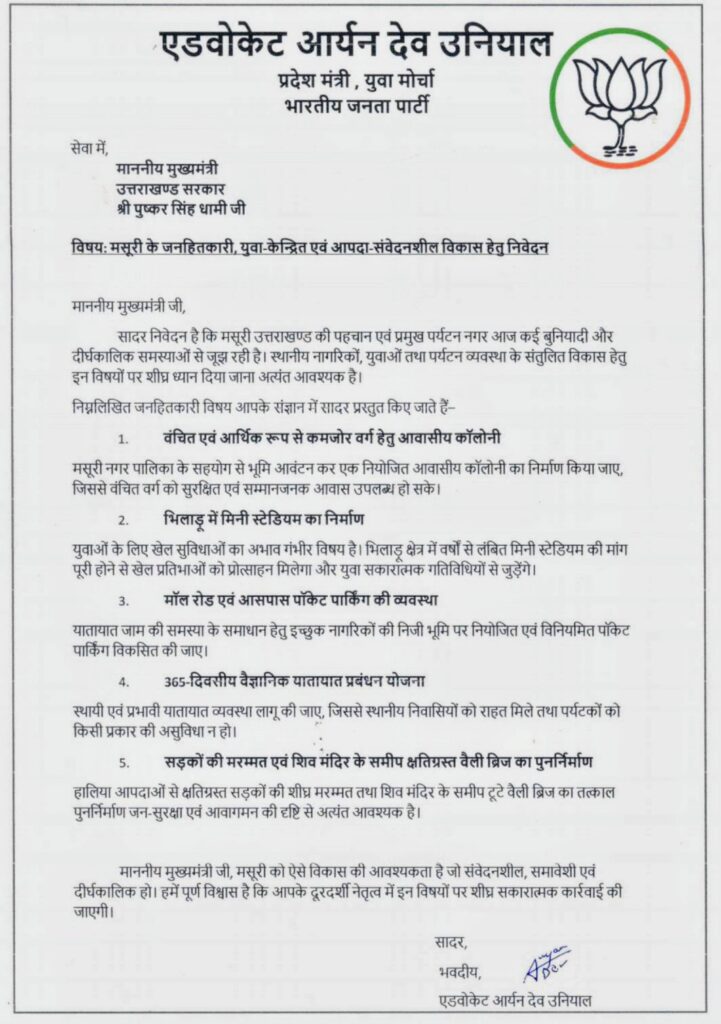 आर्यन देव उनियाल ने पत्र के माध्यम से मुख्यमंत्री को मसूरी में ऐसे विकास की आवश्यकता पर बल दिया जिसमें संवेदनशील समावेशी एवं दीर्घकालीन विकास हो।