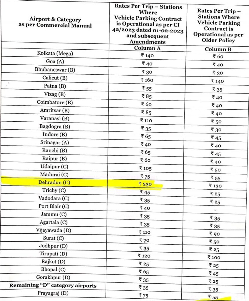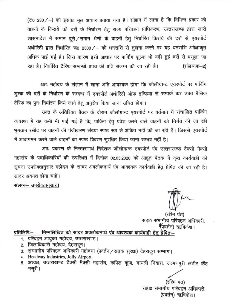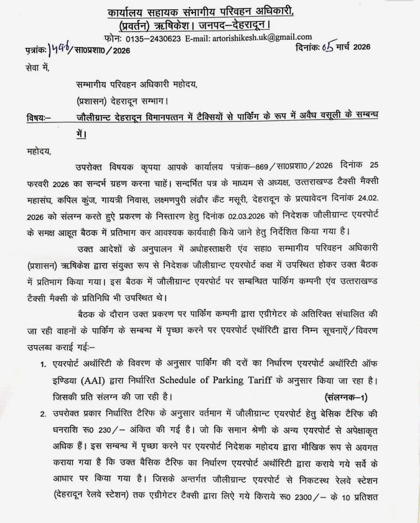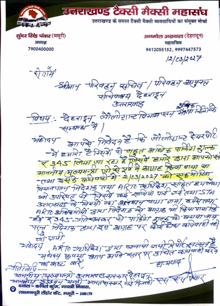 सुंदर सिंह पंवार अध्यक्ष उत्तराखंड टैक्सी मैक्सी महासंघ द्वारा बताया गया कि ज्ञापन में परिवहन सचिव को जानकारी दी गई है कि जॉली ग्रांट एयरपोर्ट पर ट्रैक्शन से अत्यधिक पार्किंग शुल्क 345₹/वाहन तक वसूला जा रहा हैं। जो कि STA उत्तराखंड के नियमों का उल्लंघन है।
