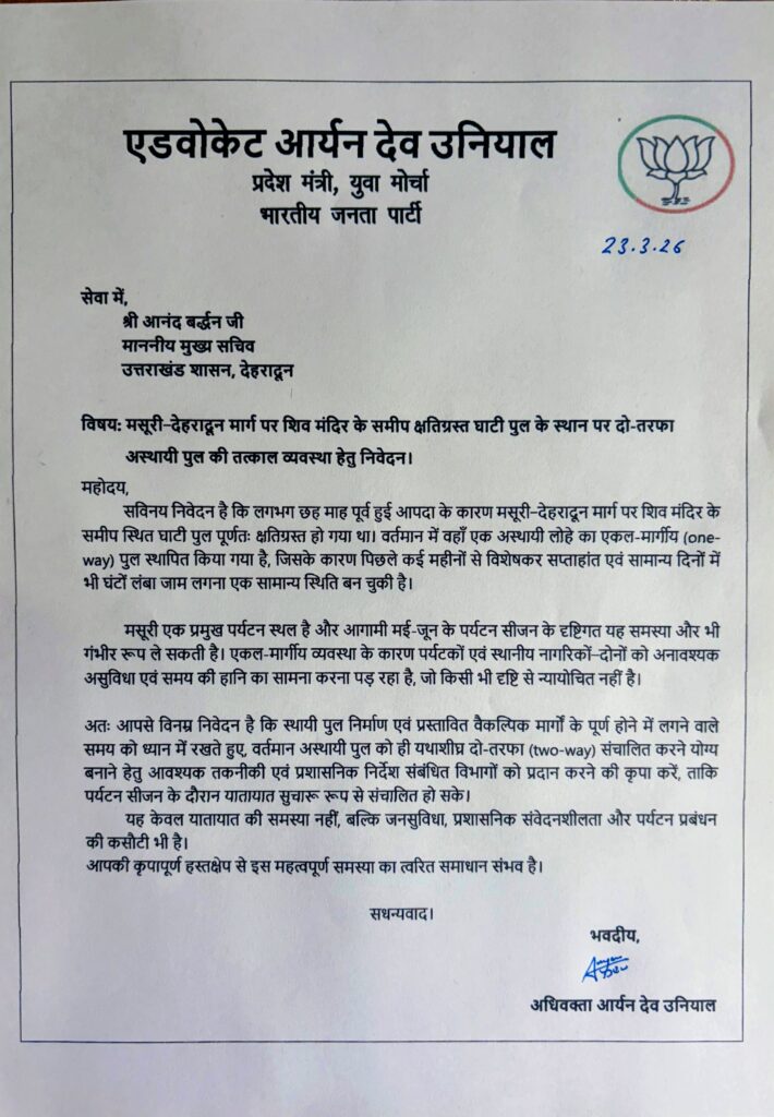 मसूरी-आर्यन देव उनियाल प्रदेश मंत्री युवा मोर्चा भारतीय जनता पार्टी ने बताया कि देहरादून मार्ग पर शिव मंदिर के समीप स्थित वैली ब्रिज, जो हाल ही में आपदा के कारण क्षतिग्रस्त हुआ था, उससे जुड़ी समस्या पहले से ही शासन के संज्ञान में है और इस पर कार्यवाही भी प्रगति पर है। स्थानीय नागरिकों एवं जनप्रतिनिधियों द्वारा लगातार उठाई जा रही इस महत्वपूर्ण समस्या के संदर्भ में उन्होंने भी अपना पक्ष रखते हुए एक ज्ञापन मुख्य सचिव आनंद वर्धन को सौंपा।