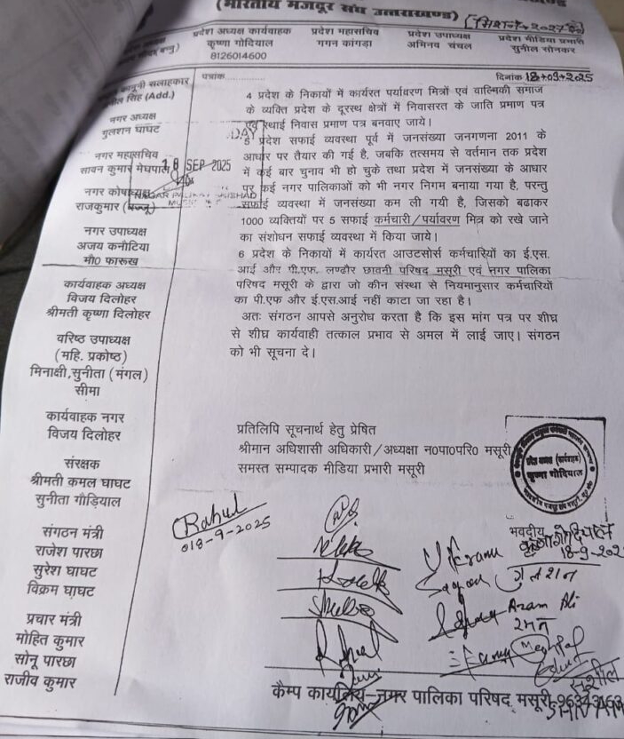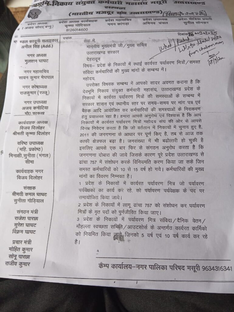 मसूरी- देवभूमि निकाय संयुक्त कर्मचारी महासंघ, मसूरी के कार्यवाहक प्रदेश अध्यक्ष कृष्णा गोदियाल द्वारा प्रदेश के निकायों में कार्यरत पर्यावरण मित्रों की समस्याओं के संबंध में शासन व प्रशासन को ज्ञापन प्रेषित किया गया।