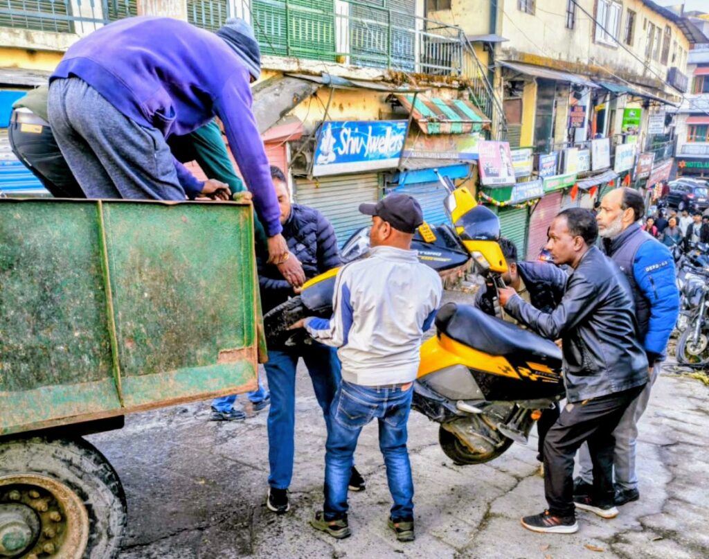 मसूरी –नगर पालिका परिषद मसूरी द्वारा प्राप्त जानकारी के अनुसार आज दिनांक 5 अप्रैल 2026 को नगर पालिका द्वारा पालिका वाहन प्रवेश द्वार पिक्चर पैलेस शहीद भगत सिंह चौक से लंढौर बाजार जानें वालें मार्ग पर सड़क किनारे खड़ी 21 दुपहिया वाहनों स्कूटी, बाइकों को जब्त किया गया।