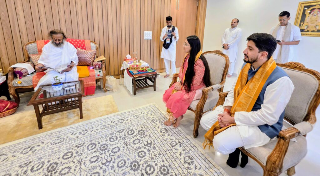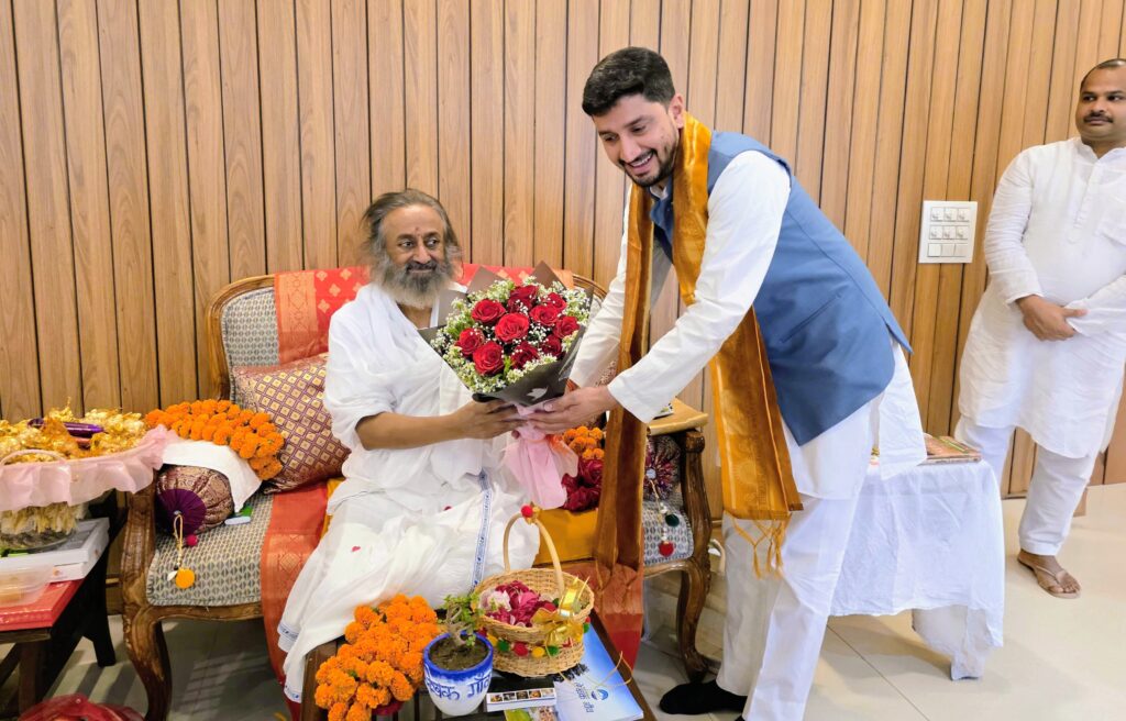 आर्यन देव उनियाल द्वारा श्रीश्री रविशंकर से भेंट कर मसूरी के हित में किया आग्रह