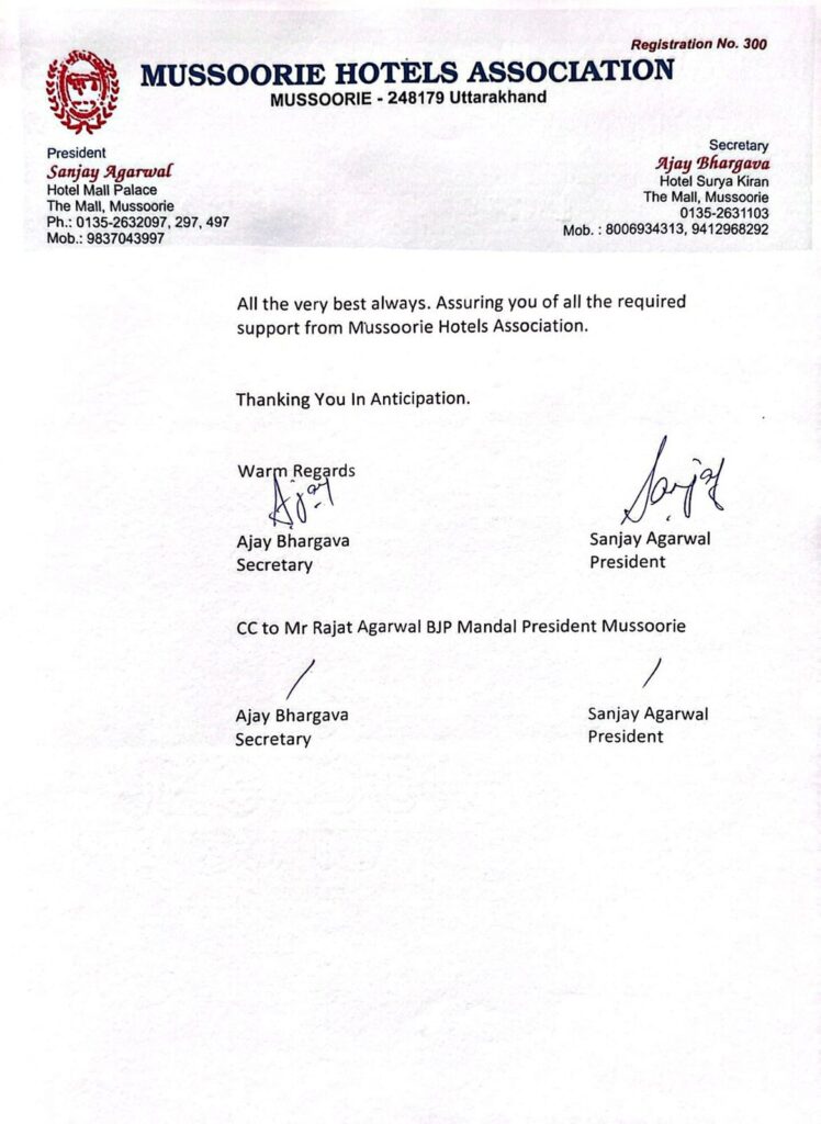 होटल एसोसिएशन मसूरी द्वारा पत्र के माध्यम से कैबिनेट मंत्री का आभार व्यक्त