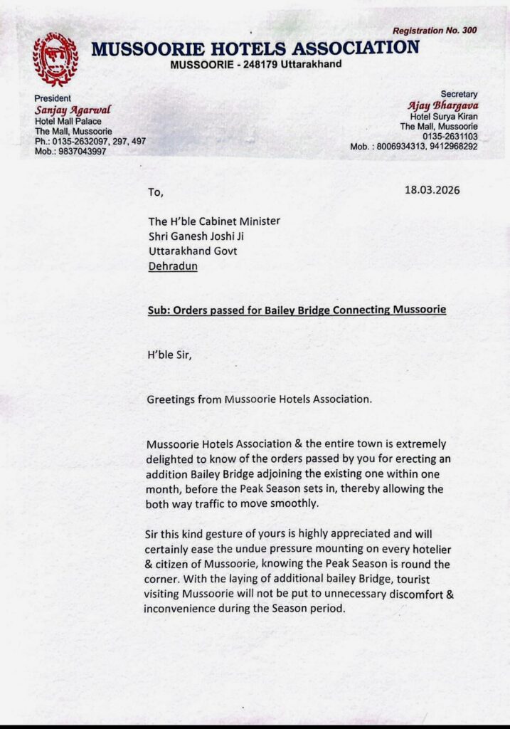 होटल एसोसिएशन मसूरी के अध्यक्ष संजय अग्रवाल द्वारा भाजपा मंडल अध्यक्ष रजत अग्रवाल के माध्यम से कैबिनेट मंत्री गणेश जोशी को पत्र भेजकर आभार व्यक्त किया कि उन्होंने मसूरी वासियों और व्यापारियों की पीड़ा को समझा कैबिनेट मंत्री ने पर्यटन सीजन प्रारंभ होने से पहले वैकल्पिक वैली ब्रिज निर्माण हेतु विभागीय अधिकारियों को निर्देशित किया।