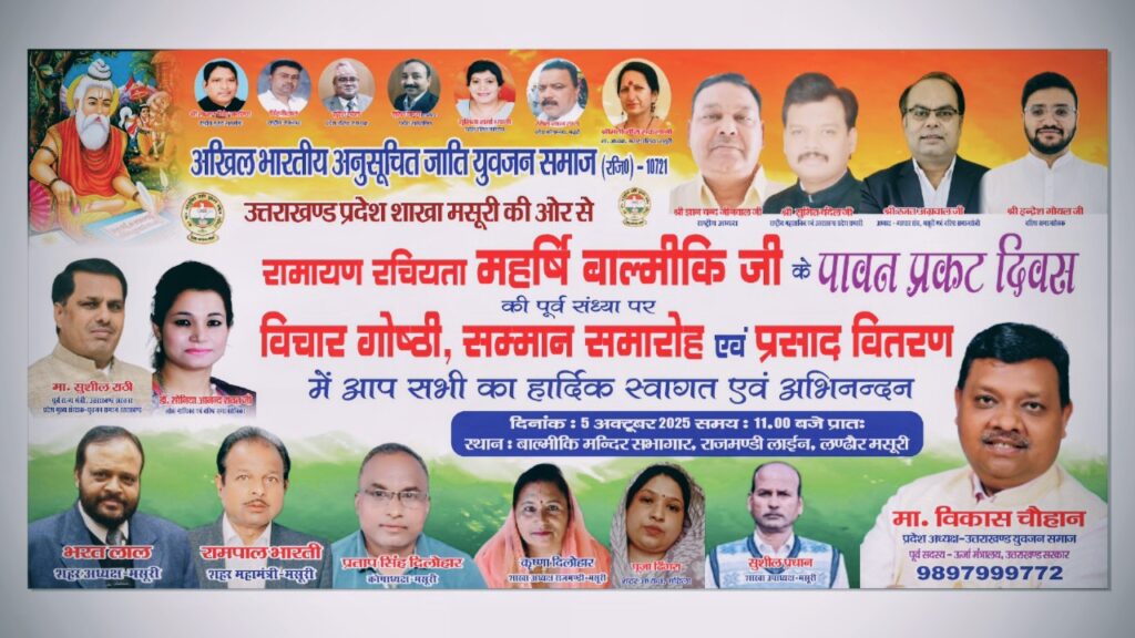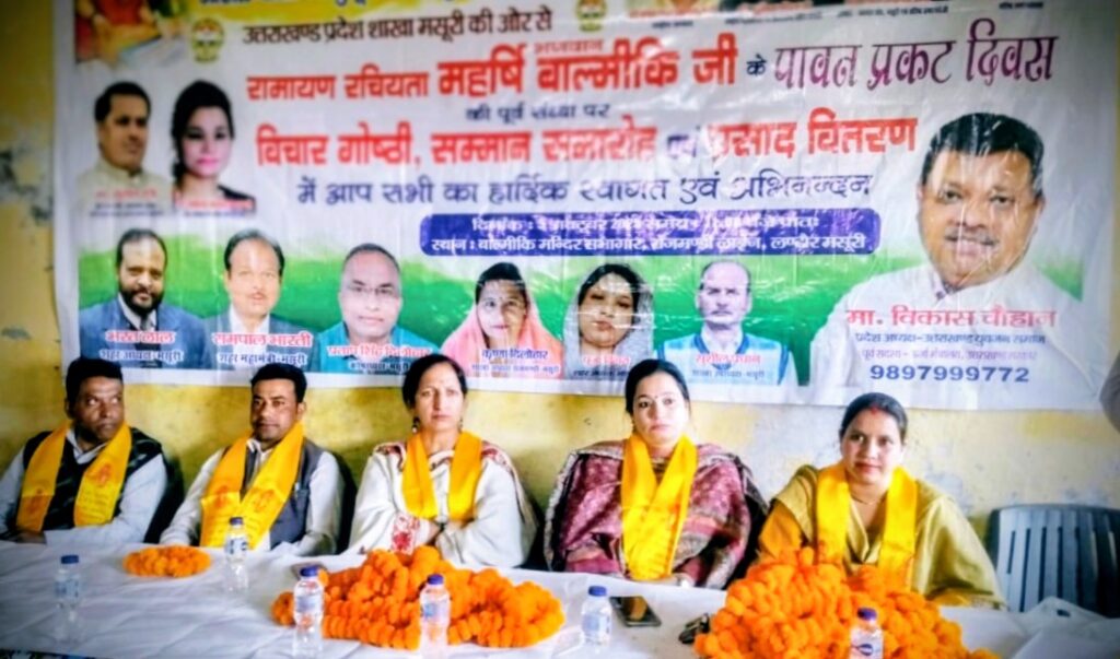 मसूरी–अखिल भारतीय अनुसूचित जाति यूव जन समाज शाखा मसूरी द्वारा वाल्मीकि जयंती के अवसर पर जयंती की पूर्व संध्या पर मसूरी के राजमंडी में वाल्मीकि मंदिर सभागार में विचार गोष्ठी एवं सम्मान समारोह आयोजित किया गया।