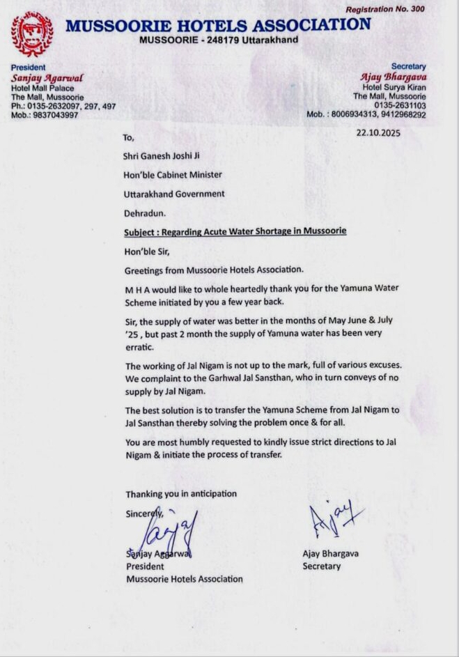 संजय अग्रवाल अध्यक्ष होटल एसोसिएशन मसूरी द्वारा बताया गया कि पेयजल आपूर्ति ना मिलने के कारण होटल व्यवसाय और घरों में भी पानी की किल्लत देखने को मिल रही है। संजय अग्रवाल ने बताया कि आज उनके संगठन द्वारा कैबिनेट मंत्री गणेश जोशी को पत्र प्रेषित किया है की मसूरी शहर में पेयजल संकट दिन पर दिन बढ़ता जा रहा है। गढ़वाल जल संस्थान और जल निगम आमजन को हो रही समस्याओं को कम करने में पूर्णतः विफल नजर आ रहे हैं।